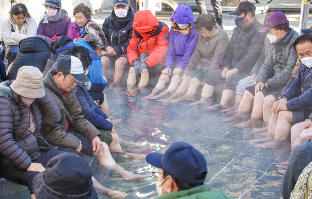 부산 지역 아침 최저기온이 영하 2.5도까지 떨어진 22일 동래구 동래온천 노천 족욕탕을 찾은 시민들이 따뜻한 온천물에 발을 담근 채 추위를 녹이고 있다.