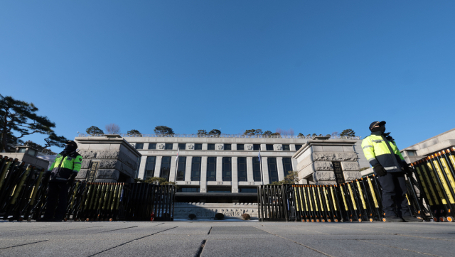 윤석열 대통령 탄핵심판 첫 변론준비기일을 닷새 앞둔 22일 서울 종로구 헌법재판소 앞에서 경찰들이 출입을 통제하고 있다. 연합뉴스