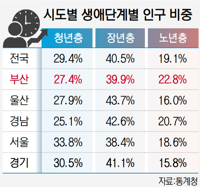 부산은 총인구 321만 7000명 중에서 청년층은 88만 1000명으로, 27.4%를 차지했다. 중장년층은 128만 3000명으로 39.9%, 노년층은 73만 2000명으로 22.8%였다. 부산의 청년층 인구 비중은 8개 특별·광역시 중에서 가장 낮고 노년층은 가장 높았다. 중장년층은 비슷한 수준이었다.