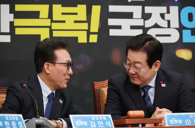 더불어민주당 이재명(오른쪽) 대표와 김민석 최고위원이 23일 서울 여의도 국회에서 열린 최고위원회의에 참석해 대화하고 있다. 연합뉴스