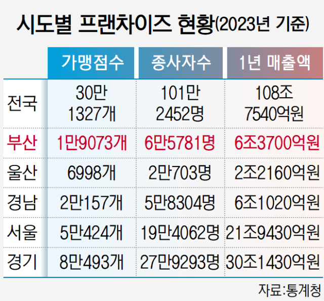 부산은 프랜차이즈매장이 1만 9000개를 넘었으며 종사자수는 6만 5000여명에 달한다.