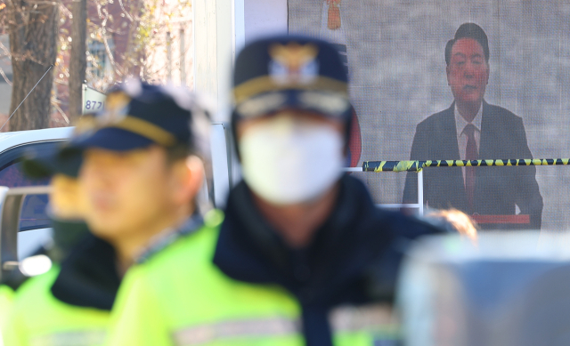 24일 오후 서울 용산구 한남동 대통령 관저 인근에 세워진 윤석열 대통령 지지자 유세차량에 윤 대통령 영상이 재생되고 있다. 윤 대통령 수사 변호인단·탄핵심판 대리인단 구성에 관여하고 있는 석동현 변호사는 이날 25일 예정된 고위공직자범죄수사처의 피의자 조사에 윤 대통령이 출석하기 어렵다는 입장을 밝힌 바 있다. 연합뉴스