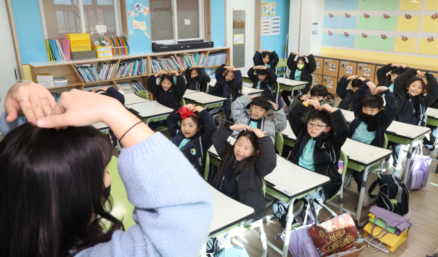 24일 오후 부산 금정구 청룡동 부산삼육초등학교 1학년 교실에서 겨울 방학식을 마치고 귀가를 앞둔 학생들이 담임 선생님과 밝은 표정으로 인사를 나누고 있다.