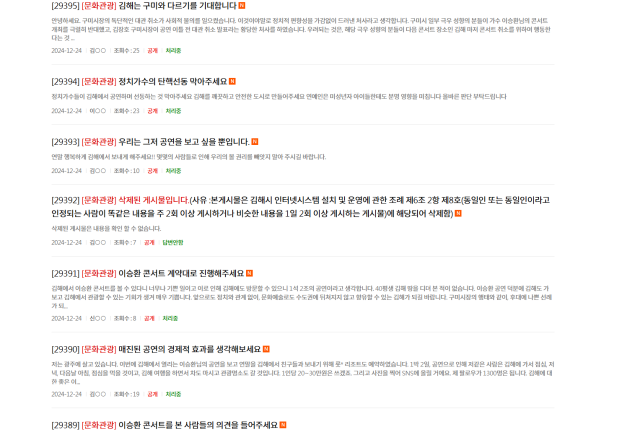 ‘김해는 구미와 다르길 바란다’ ‘공연을 계약대로 진행하라’ ‘공연이 그저 보고 싶을 뿐’ ‘경제적 효과를 생각하라’ ‘시장님을 믿는다’는 누리꾼들의 주장과 ‘정치 가수 탄핵 선동 막아달라’ ‘콘서트 취소하라’ ‘공연에서 정치 발언하지 않겠다는 서약을 받아라’ 등 의견이 엇갈렸다.