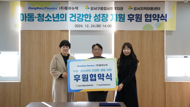 (주)동화뉴텍(대표 권영우)은 지난 24일 부산 강서구종합사회복지관·강서지역아동센터와 아동·청소년의 건강한 성장을 지원하는 후원 협약식을 가졌다.