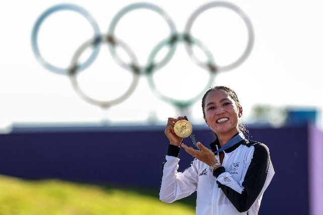 리디아 고가 지난 8월 열린 2024 파리 올림픽 골프 여자부 경기에서 우승한 후 금메달을 들고 환하게 웃고 있다. AFP연합뉴스