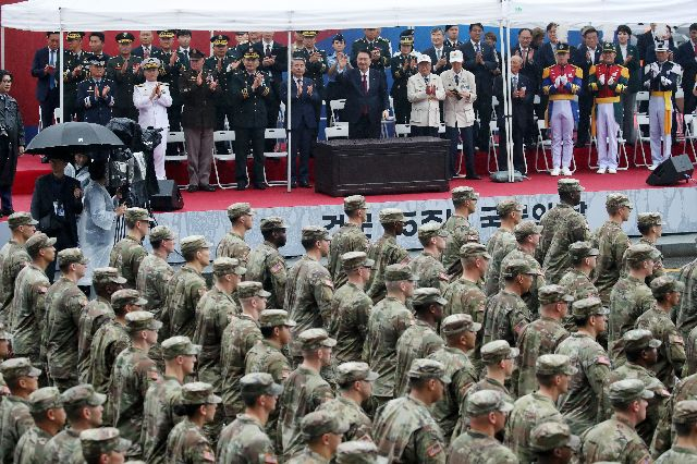 <YONHAP PHOTO-3571> 시가행진 참여 미군 제대에 인사하는 윤석열 대통령 (서울=연합뉴스) 진성철 기자 = 건군 75주년 국군의날 시가행진이 열린 26일 서울 광화문 광장 관람무대에서 윤석열 대통령이 시가행진하는 미군 제대 장병들에게 인사하고 있다. 2023.9.26 [대통령실통신사진기자단] zjin@yna.co.kr/2023-09-26 17:09:22/ <저작권자 ⓒ 1980-2023 ㈜연합뉴스. 무단 전재 재배포 금지.> 2023.09.26 부산일보DB