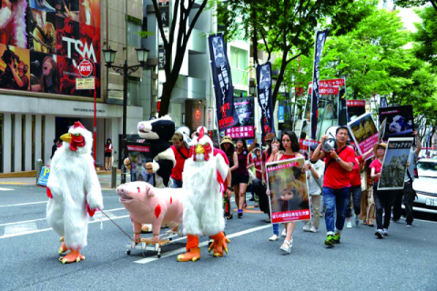 <동물 유토피아를 찾아서> 저자 룽위안즈가 2016년 6월 일본 도쿄에서 전국 도축장 폐쇄 청원 가두시위를 벌이고 있다. 산지니 제공