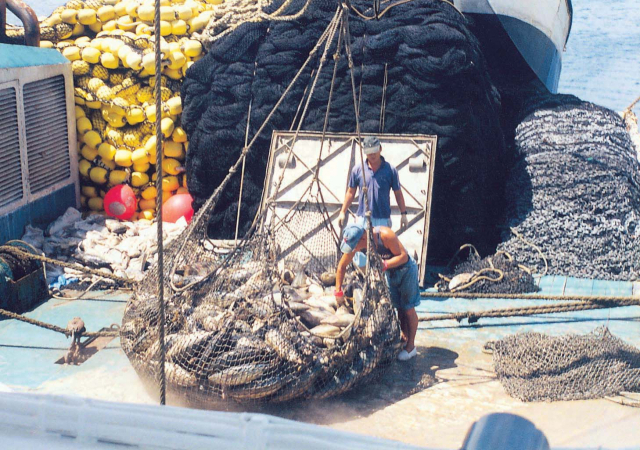원양선망어선에서 직원들이 참치를 어획하고 있는 모습. 부산일보DB