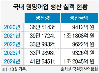 한국원양산업협회(이하 원양협회)는 올해 10월까지 누적 생산량이 41만 6451t으로 지난해 동기간(33만 9898t)보다 23% 증가했다고 25일 밝혔다. 생산 금액은 1조 2945억 원으로 작년(9326억 원) 대비 약 40% 늘었다. 이 수치는 최근 5년(2020~2024년) 중 가장 높은 기록이다.