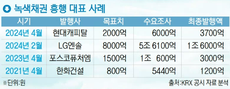 시기와 업종 상관없이 녹색채권은 웬만하면 흥행한다는 게 금융계의 설명이다. 수요 예측에서 당초 계획을 압도하는 자금이 몰리는 것도 일반적인 현상이다.