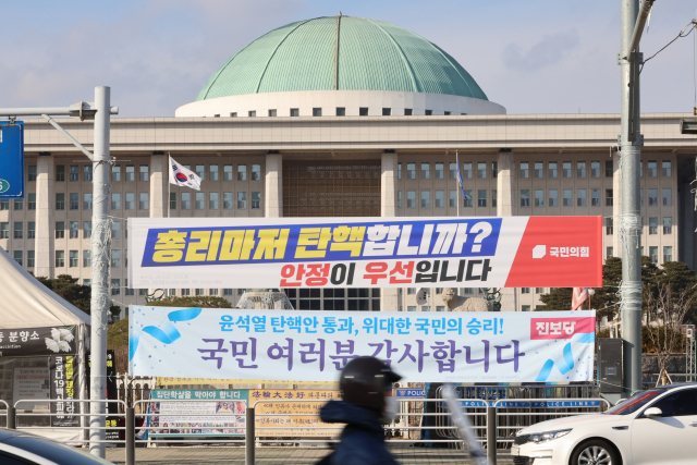 더불어민주당이 한덕수 대통령 권한대행 국무총리에 대한 탄핵소추안을 만장일치 당론으로 채택한 가운데 25일 서울 여의도 국회의사당 정문에 "총리마저 탄핵합니까? 안정이 우선입니다"라고 적힌 국민의힘의 현수막이 걸려 있다. 연합뉴스