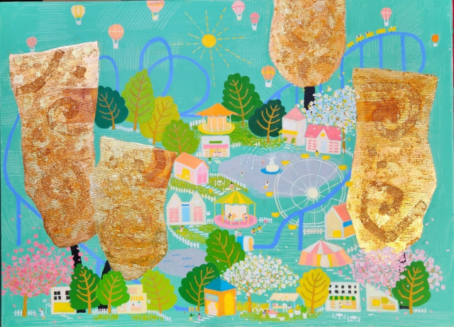 이번 전시 제목인 ‘Wonderful land’는 놀이공원처럼 변신한 마을의 풍경을 담고 있다. 마을 길은 롤러코스터 레일로 변했고 작은 저수지는 호수나 연못으로 변했다. 내가 발을 딛고 서 있는 이곳, 나의 일상이 펼쳐지는 곳이 바로 ‘원더풀 랜드’가 될 수 있다는 희망을 말하고 싶었던 것 같다.