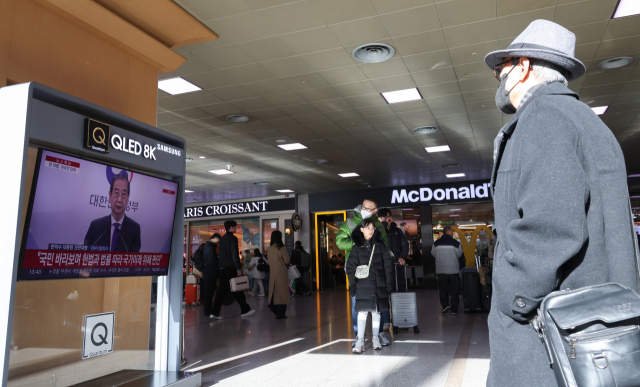 26일 서울역에서 시민들이 한덕수 대통령 권한대행 국무총리 대국민 담화를 시청하고 있다. 연합뉴스