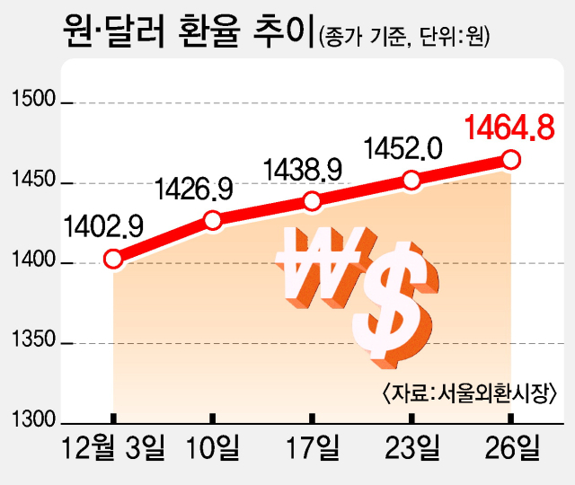 26일 서울 외환시장에서 따르면 원달러 환율은 전 거래일보다 8.4원 오른 1464.8원에 장을 마감했다. 이는 종가 기준으로 2009년 3월 13일(1485.5원) 이후 최고치다.