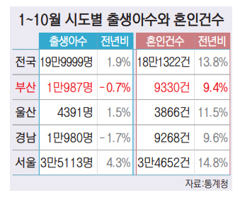 부산 10월 출생아 전년 대비 7.3%↑…혼인 건수 936건으로 7.5% 증가