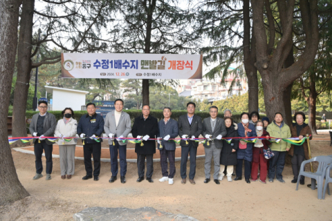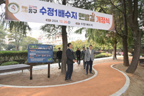 부산광역시 다동구(구청장 김진홍)는 12월 26일 구청장, 시·구의원, 지역주민 등 80여 명이 참석한 가운데 수정1배수지 맨발길 준공을 기념하는 개장식을 개최했다. 개장식은 테이프 커팅식과 함께 시설 관람 등이 진행되어 수정1배수지 맨발길의 첫걸음을 축하하는 화합의 장이 됐다.