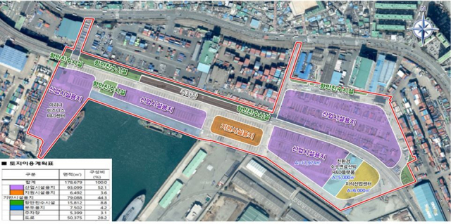 부산항(우암부두) 해양산업클러스터 개요(전체 면적 17만 8504㎡, 임대가능 면적 9만 2534㎡). 해수부 제공