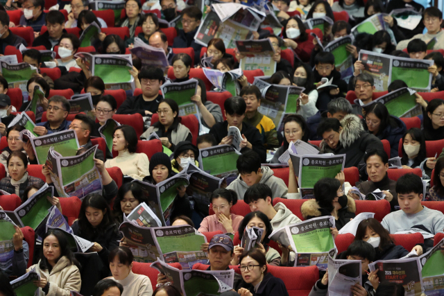 2025학년도 대입 정시 모집이 31일부터 시작되면서 수험생들의 치열한 눈치 작전이 시작될 전망이다. 지난 8일 성균관대학교에서 열린 종로학원 정시 전략 설명회에 참석한 학생과 학부모들이 입시자료를 살펴보고 있다. 연합뉴스