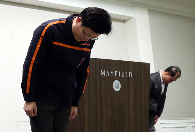제주항공 김이배 대표가 29일 사고 관련 브리핑 도중 허리 숙여 인사하고 있다. 연합뉴스