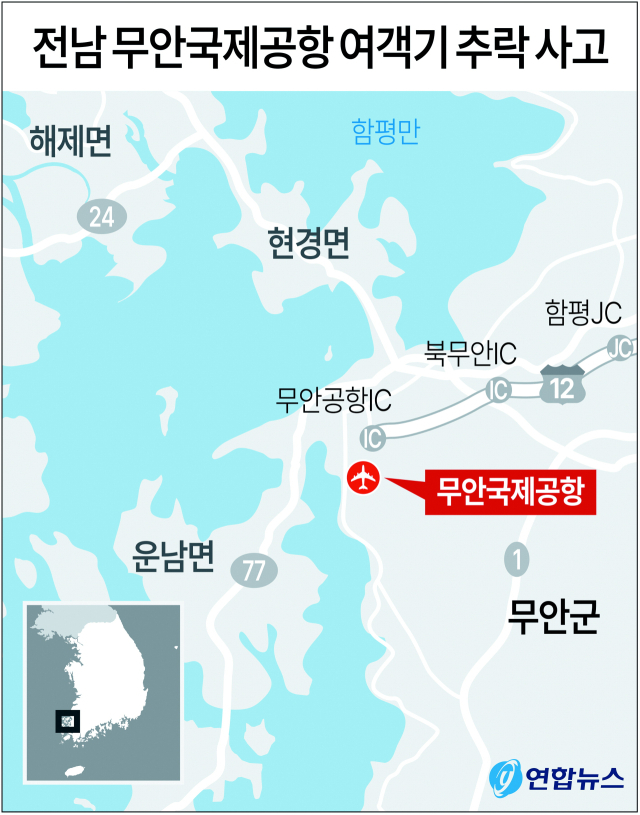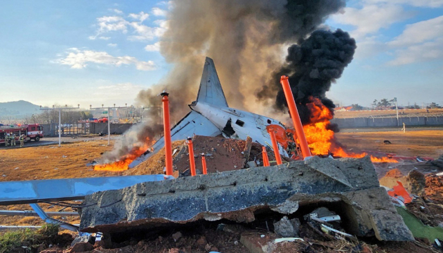 29일 오전 9시 3분께 전남 무안 무안국제공항에서 181명을 태운 제주항공 여객기가 활주로 외벽에 충돌한 뒤 불길에 휩싸였다. 연합뉴스