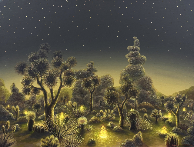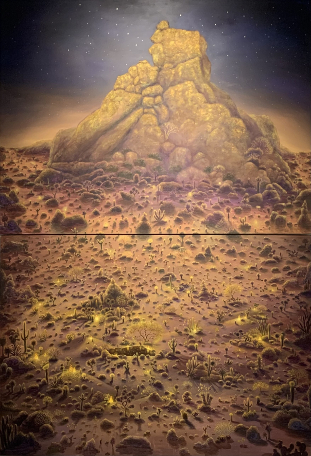 전시장 중앙에 있는 가로 2.5m, 세로 3.75m의 대작 ‘Big Rock’은 단연 시선을 압도한다. 사막의 낮에는 보이지 않지만, 그 자리에서 강인한 생명력을 지닌 작은 식물과 거대한 바위를 함께 그렸다. 작품은 관객들을 일시에 낯선 세계로 이동시켜주는 것 같다. 그외에 김 작가 특유의 아름다운 풍경 작품이 이어진다. 사실 김 작가의 그림은 실제 풍경이 아니라 김 작가가 평소 수집한 이미지들의 조합이다. 작가가 재구성한 자연은 신화, 탄생과 소멸, 역사가 뒤엉켜 현실과 상상이 넘나드는 독특한 분위기를 만든다.