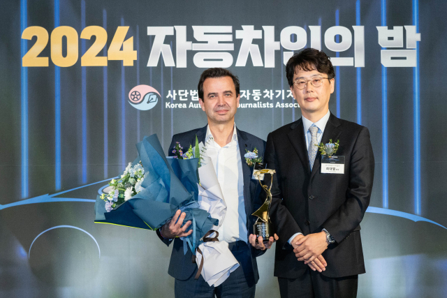 르노코리아 스테판 드블레즈 사장이 지난해 6월 ‘2024 부산모빌리티쇼’에서 ‘뉴 르노 그랑 콜레오스’를 소개하고 있다(왼쪽). 지난해 11월 한국자동차기자협회의 ‘2024 자동차인’ 산업부문 혁신상 수상 모습. 르노코리아·한국자동차기자협회 제공