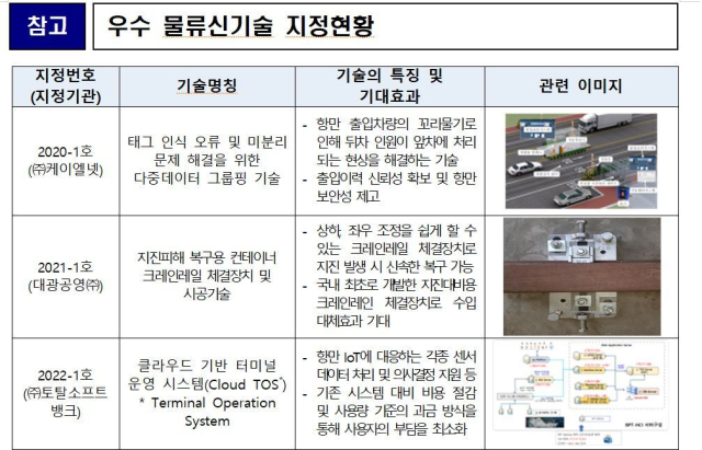 강도형 해수부 장관은 “이번 우수물류신기술 지정제도 개선을 통해 디지털·친환경 등 혁신적인 해운물류신기술을 발굴해 현장에서의 활용을 적극 지원하겠다”고 말했다.