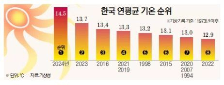2024년은 우리나라 연평균 기온이 사상 처음 14도를 돌파했다. 재작년에 이어 2년 연속 연평균 기온 신기록을 갈아치우며 지구가 뜨거워지고 있음을 보여줬다.