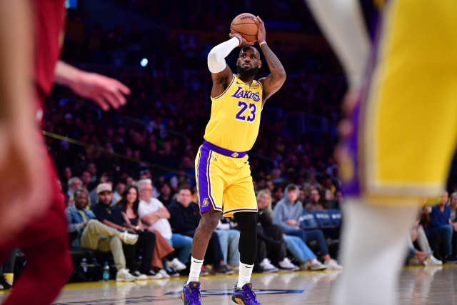 레이커스의 르브론 제임스가 1일 캐벌리어스와 경기에서 외곽슛을 날리고 있다. 연합뉴스