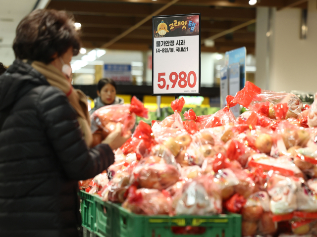 작황 부진에 따라 농산물 물가 상승률이 높은 수준을 기록하면서 대형마트가 ‘물가안정 사과’를 선보이고 있다. 1일 서울의 한 대형마트 과일 코너에서 ‘물가안정 사과’를 구매하는 시민의 모습. 연합뉴스