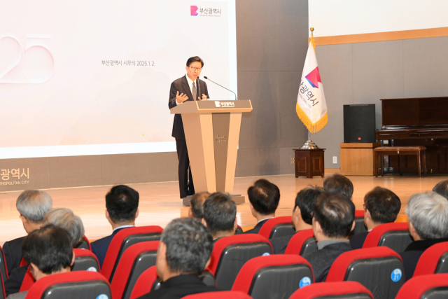 2일 부산시청 대강당에서 열린 2025년 부산시 시무식에서 박형준 부산시장이 신년사를 하고 있다. 부산시 제공