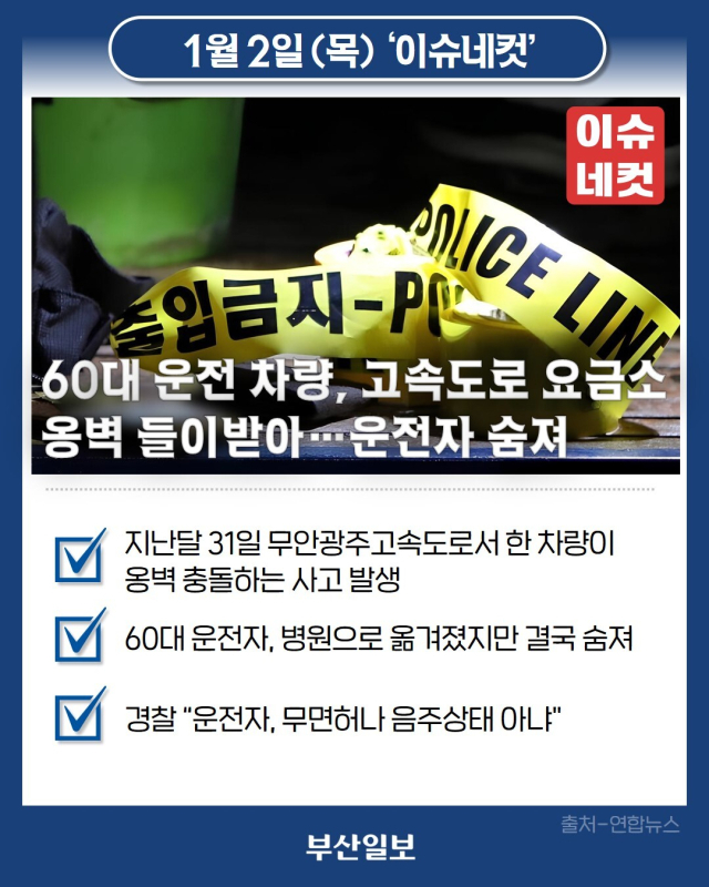 전남 무안광주고속도로에서 60대 운전자가 요금소 옹벽을 들이받고 숨지는 일이 발생했습니다. 전남경찰청 고속도로순찰대에 따르면 지난달 31일 오후 7시 30분께 무안광주고속도로 북무안 나들목에서 한 차량이 하이패스 차로와 요금소를 구분하는 옹벽을 들이받는 사고를 냈습니다. 당시 차량 운전자 60대 남성 A 씨는 큰 부상을 입고 병원으로 옮겨졌으나 끝내 숨졌습니다. 조사 결과 A 씨는 음주 상태나 무면허도 아니었던 것으로 전해졌습니다. 이에 경찰은 인근 CCTV와 블랙박스를 분석해 정확한 사고 원인을 파악 중입니다.