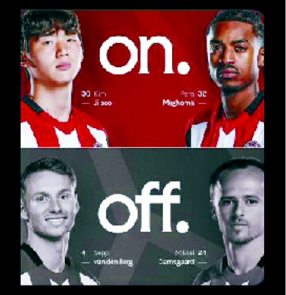 김지수(윗줄 첫 번째) 등 교체 선수의 투입을 알린 브렌트퍼드 엑스. 브렌트퍼드 구단 엑스 캡처