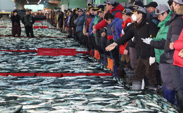 국내 최대 산지 수산물 위판장인 부산공동어시장의 새해 첫 경매가 시작된 2일 오전 중도매인들이 첫 경매를 진행하고 있다. 부산공동어시장은 올해 위판 목표를 16만t, 3000억 원으로 책정했다.