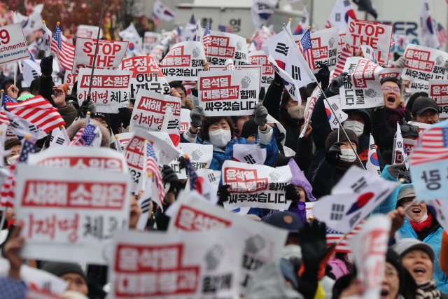 윤석열 대통령에 대한 고위공직자범죄수사처(공수처)의 체포영장 유효기간 만료를 하루 앞둔 5일 서울 용산구 대통령 관저 인근에서 보수단체가 대통령 체포 및 탄핵 반대 집회를 하고 있다. 연합뉴스
