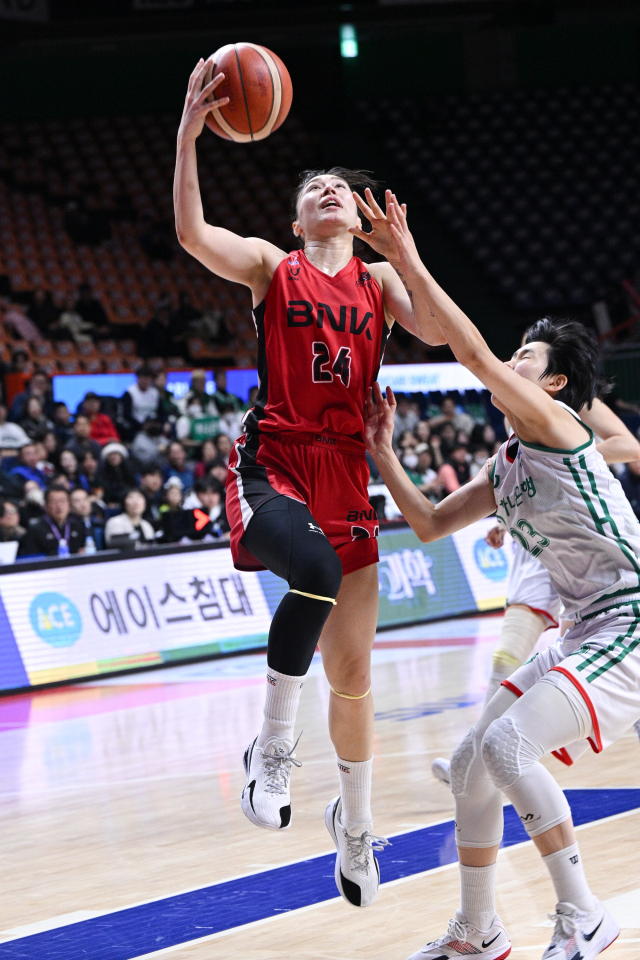 부산 BNK의 김소니아(왼쪽)가 5일 부산 사직실내체육관에서 열린 하나은행과의 경기에서 골밑슛을 성공시키고 있다. WKBL 제공