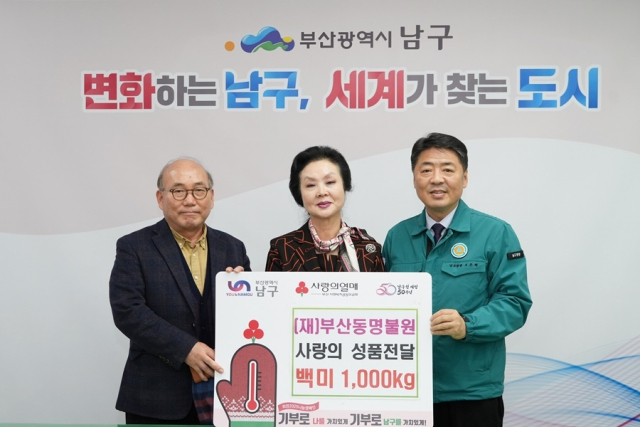 (재)부산동명불원(이사장 김경조)은 최근 부산 남구(구청장 오은택)에 어려운 이웃을 위해 백미 10kg 100포를 기부했다.