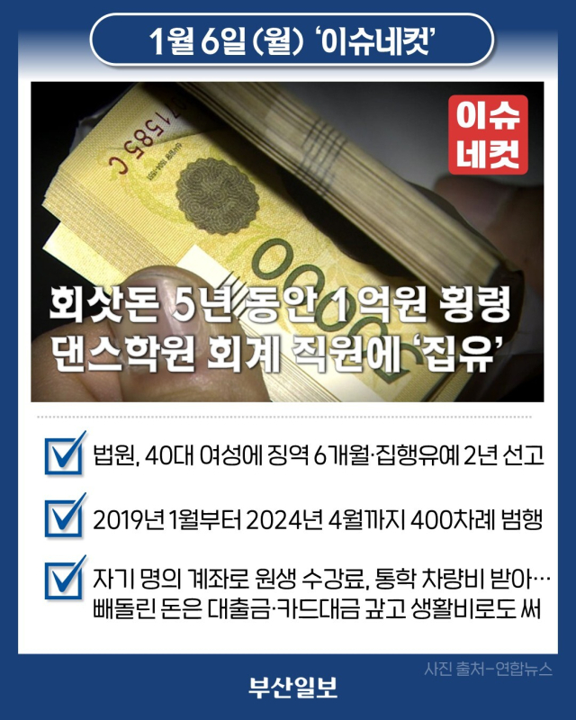3. 회삿돈 5년 동안 1억원 횡령…댄스학원 회계 직원에 ‘집유’