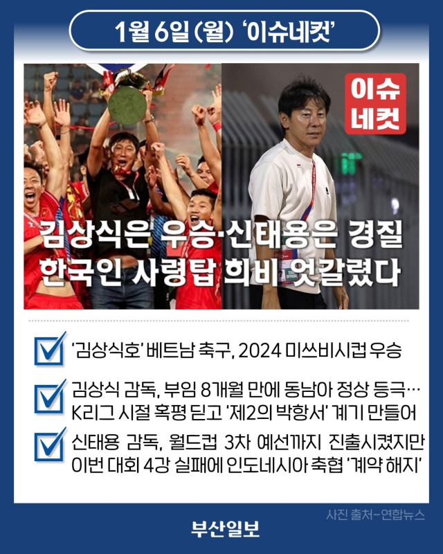 '김상식호' 베트남 축구대표팀이 지난 5일 태국을 꺾고 동남아시아 최대 축구 축제 2024 미쓰비시컵 챔피언에 오른 가운데, 동남아에 진출한 한국인 감독들의 희비가 엇갈렸습니다. 김상식 감독은 지난해 5월 베트남 지휘봉을 잡은 뒤 불과 8개월 만에 팀을 동남아 정상에 올려놓았는데요. 이전 K리그 시절 불거진 지도력에 대한 혹평을 딛고 '제2의 박항서'로 불릴 수 있는 '장기집권' 계기도 마련했습니다. 반면 신태용 인도네시아 대표팀 감독은 지난 5년간 팀을 장기간 이끌며 월드컵 3차 예선까지 진출시키는 성과를 냈지만, 이번 대회 조별리그에서 3위에 그치는 바람에 4강 진출에 실패하면서 6일 축구협회로부터 계약해지 통보를 받았습니다.