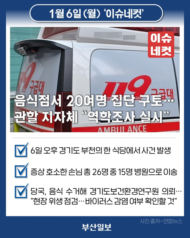 6일 오후 1시 45분쯤 경기도 부천시의 한 음식점에서 손님들이 단체로 구토 증상을 보인다는 신고가 119에 접수됐습니다. 소방 당국이 출동해 확인한 결과 당시 손님 26명이 구토 증상을 호소한 것으로 파악됐는데요. 이중 15명은 병원으로 옮겨졌고, 식당에서 대기하던 중 건강 상태가 나아진 11명은 귀가하거나 자체적으로 병원에 방문하겠다는 의사를 밝혔습니다. 관할 지방자치단체인 부천시는 식당에서 제공된 음식을 수거해 경기도보건환경연구원에 검사를 의뢰하고 역학조사를 실시할 계획입니다. 부천시 관계자는 "현장에 인력을 투입해 위생 점검을 진행하고 있다"며 "바이러스 감염 여부 등을 확인할 것"이라고 말했습니다.