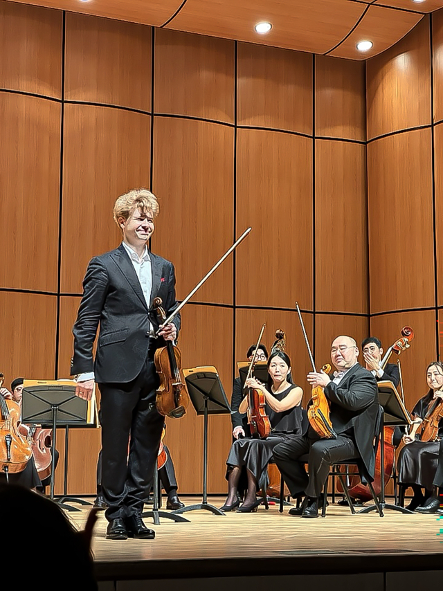 바이올리니스트 플로린 일리에스쿠(프랑크푸르트 방송교향악단 종신 악장)가 지난 4일 부산문화회관 중극장에서 열린 '2025 부산문화회관 챔버 페스티벌-부산체임버오케스트라 with Florin Iliescu'에서 커튼콜을 하고 있다. 김은영 기자 key66@
