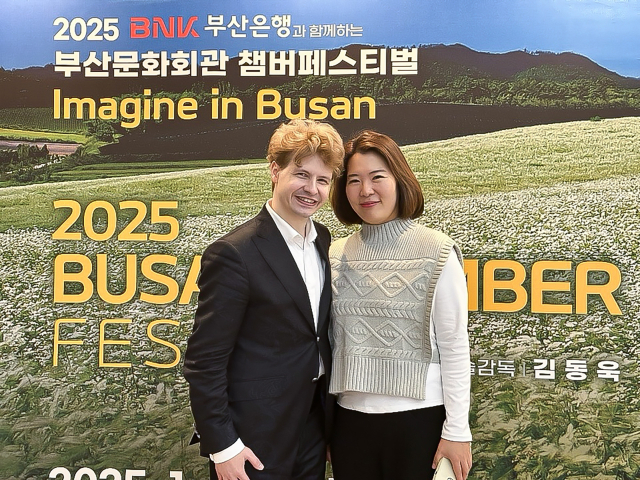 부산문화회관 중극장 로비에 설치된 '2025 부산문화회관 챔버 페스티벌' 포토월 앞에서 포즈를 취한 바이올리니스트 플로린 일리에스쿠(왼쪽)와 이지영 씨 부부. 김은영 기자 key66@