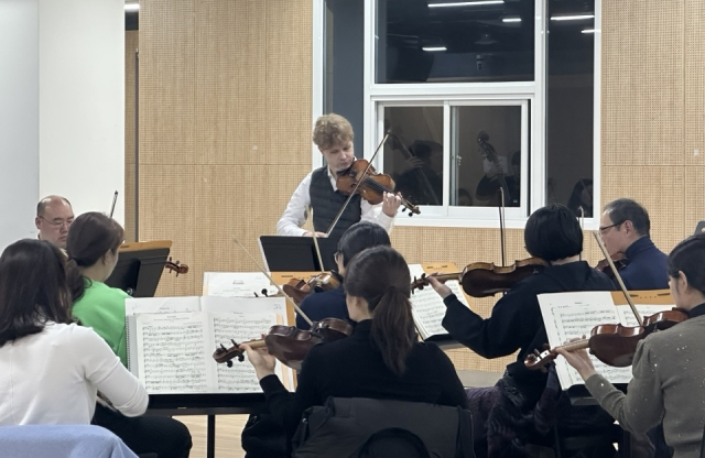 플로린 일리에스쿠(정면 가운데)가 '2025 부산문화회관 챔버 페스티벌-부산체임버오케스트라 with Florin Iliescu' 연주를 앞두고 지난 2일 금정문화재단 연습실에서 리허설을 하고 있다. 김은영 기자 key66@