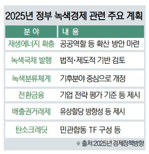정부가 오는 3월까지 재생에너지 보급 확산 방안을 내놓기로 했다. 연내에는 녹색산업 여부를 판단하는 ‘한국형 녹색분류체계(택소노미)’를 기후 분야 중심으로 개정한다. 시민 사회는 지난 6년간 발행된 ‘녹색채권 사용처 전수조사 결과’(2024년 11월 28일자 1면 등 보도)를 녹색금융 정책의 구조적 변화에 맞춰 적극적으로 활용하겠다는 구상을 내놓았다.