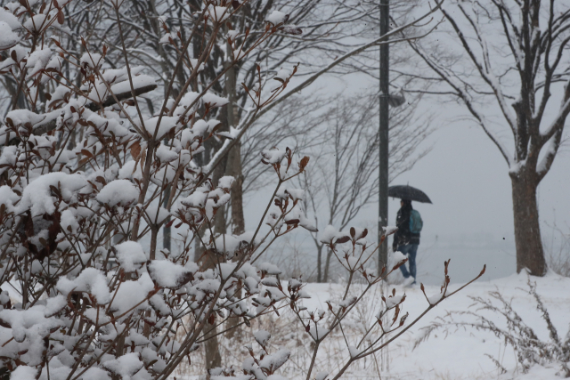 강원 내륙과 산지를 중심으로 대설특보가 내려진 5일 오전 춘천 공지천 일대에 많은 눈이 쌓인 가운데 시민이 산책하고 있다. 연합뉴스