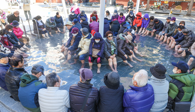 지난달 22일 부산 동래구 동래온천노천족욕탕을 찾은 시민들이 온천물에 발을 담근 채 추위를 녹이고 있다. 김종진 기자 kjj1761@