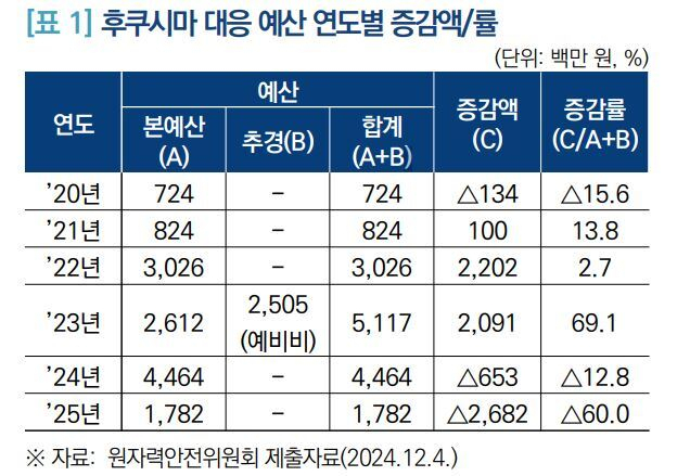 보고서는 또 “무엇보다 후쿠시마 오염수는 긴 기간에 걸쳐 방류될 예정이고 오염수의 농도 역시 점차 높아질 것으로 예상되는 만큼, 관련 대응정책과 사업이 차질 없이 지속·이행될 수 있어야 한다”며 “이를 위해서는 안정적 예산과 정책이 필수적이다. 국내 해역에의 영향을 조사하기 위한 장비, 방식, 주기 등이 지속적으로 정밀하게 이루어지기 위한 안정적인 예산 지원과 정책 추진이 필요하다”고 덧붙였다. 최근 확정된 원자력안전위원회의 후쿠시마 오염수 대응 예산이 2024년 약 45억 원에서 2025년도 약 18억 원으로 큰 폭으로 삭감되면서 관련 정책의 지속가능성에 우려가 높다.