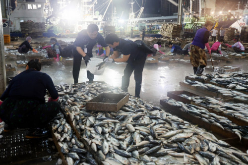 2023년 8월 29일 부산공동어시장에서 수산물 방사능 신속 검사를 위해 검사 요원이 고등어, 전갱이 등 시료 채취를 하고 있다. 부산일보DB