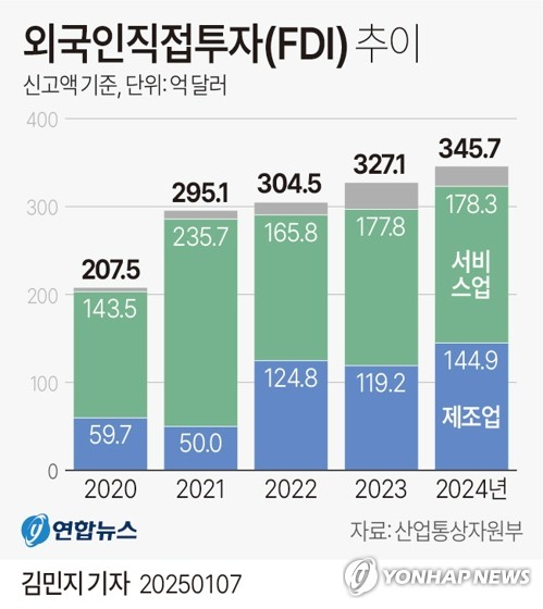 산업통상자원부는 2024년 FDI가 신고 기준으로 345억 7000만 달러로, 전년보다 5.7% 증가했다고 7일 밝혔다.